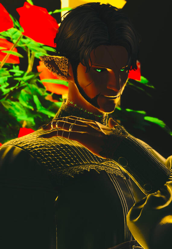 bonds. The few he holds closer than his poisons.Aurelius, his love, his first dance since the passing of his wife many moons ago. They waltz and they laugh in the ghostly moonlight of a rose garden while death nips at their heels. To meet another who does not fear the end, but to feel that brush of death along their cheek while they take the plunge, hoping for a hand to catch them. His spider lily, their reaper.Morimoto, a Raen of sweet roses and the bright sun peeking through the canopy of Atticus's life, one that can bring the true warmth of a smile upon his weathered face. Their iridescent scales that shine like the stars among the dreadful night, bright and ever lasting for him to kiss and dote upon as he wishes.His want for life, his desire to continue on for the Raen of Roses.Davien, one of the supernatural like Atticus himself, but far from the usual entitled and boring vampires one might find in the dark and frozen streets of Ishgard. Despite his cold touch, his warmth is one Atticus feels quite deeply when they are together, always doting upon the kindness that Davien shows him. To let himself fall to the hands of a creature of the night, drenched in his own blood and yearning for the prick of sharpened teeth along his ever waiting desire for death.